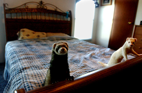 A Hallsville, Mo. woman's pet ferrets stand at the edge of her bed on Thursday, July 15, 2004. Ferrets are illegal in Boone County.
