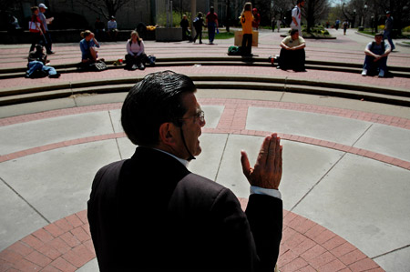 "Sister" Cindy Smock reads a Bible verse to students gathered at Speaker's Circle on the University of Missouri Campus. Cindy became a Christian after hearing "Brother" Jed speak at the University of Florida. She initially mocked Jed, who then told her to "Repent of your sins, you wicked woman." Cindy, who was studying journalism, quit school and began travelling and preaching. She and Jed were married five years later. |